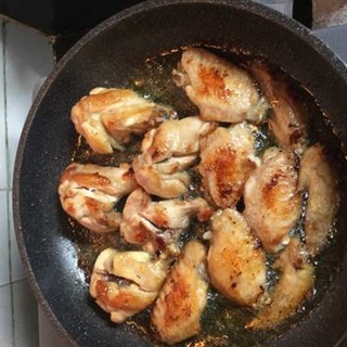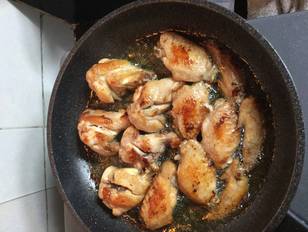 Cho một ít dầu ăn vào chảo , đun nóng. Cho hành tím vào phi thơm. Cho cánh gà và tỏi phi vào chảo xào cùng. Sau đó đổ chén nước sốt vào xào khoảng 5 phút rồi tắt. Mọi người nhớ cho vừa lửa thôi nhé.